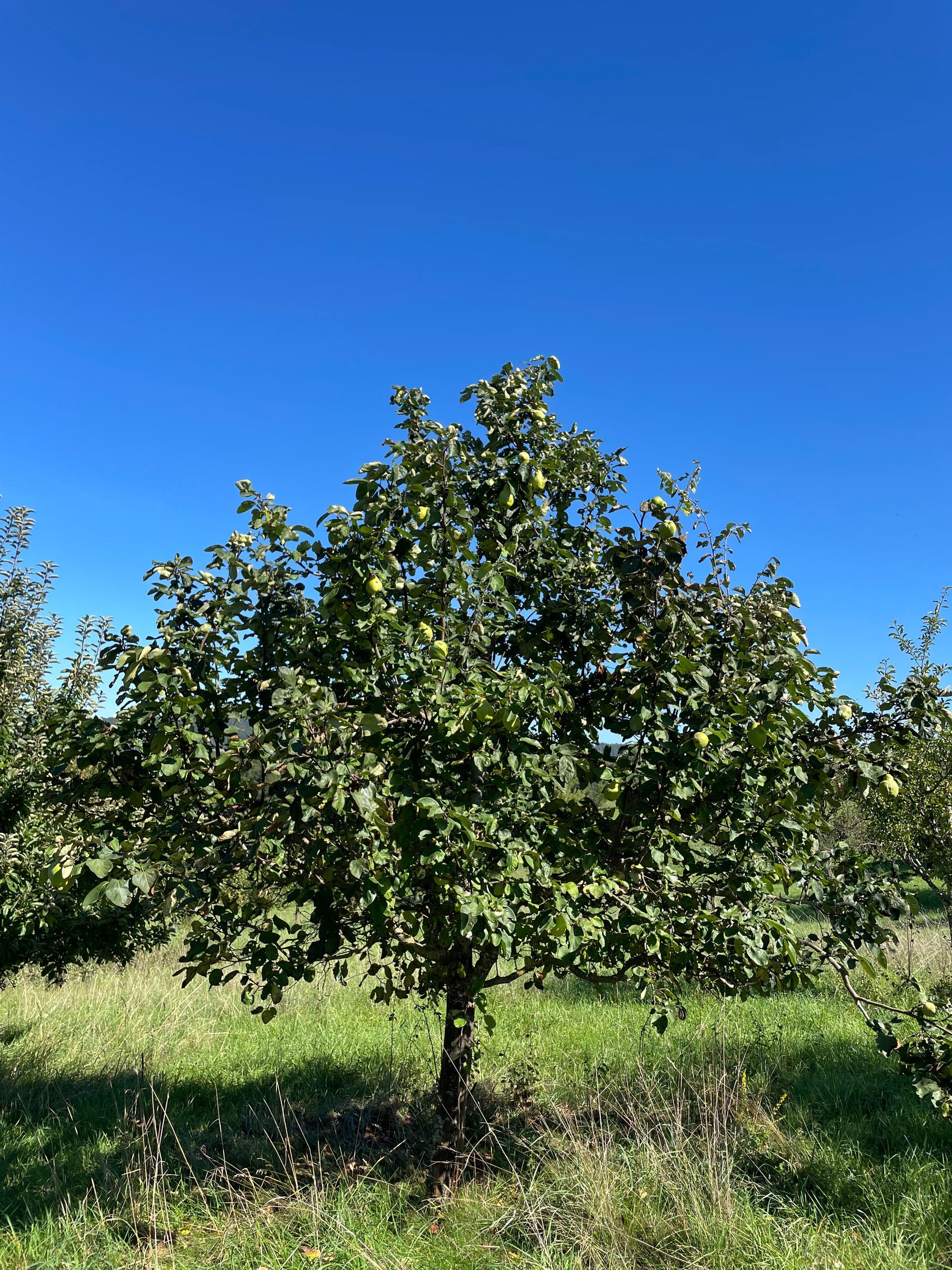 Die Birnenquitte (Cydonia oblonga) ist eine Rarität unter den Quittenarten und lässt sich nur mühevoll zubereiten. Hat man aber erst mal die harte Frucht gespalten, entkernt und in Stücke geschnitten, kann man anschließend alles einkochen und zu Saft und Mus verarbeiten. Der Saft ist erfrischend süß mit einer leicht säuerlichen und zitrusartigen Note. Das schleimige und gelierartige im Saft verdankt die Quitte dem hohen Pektin Gehalt. Aus der Frucht haben wir bereits Likör und Saft sowie Mus und Marmelade hergestellt.